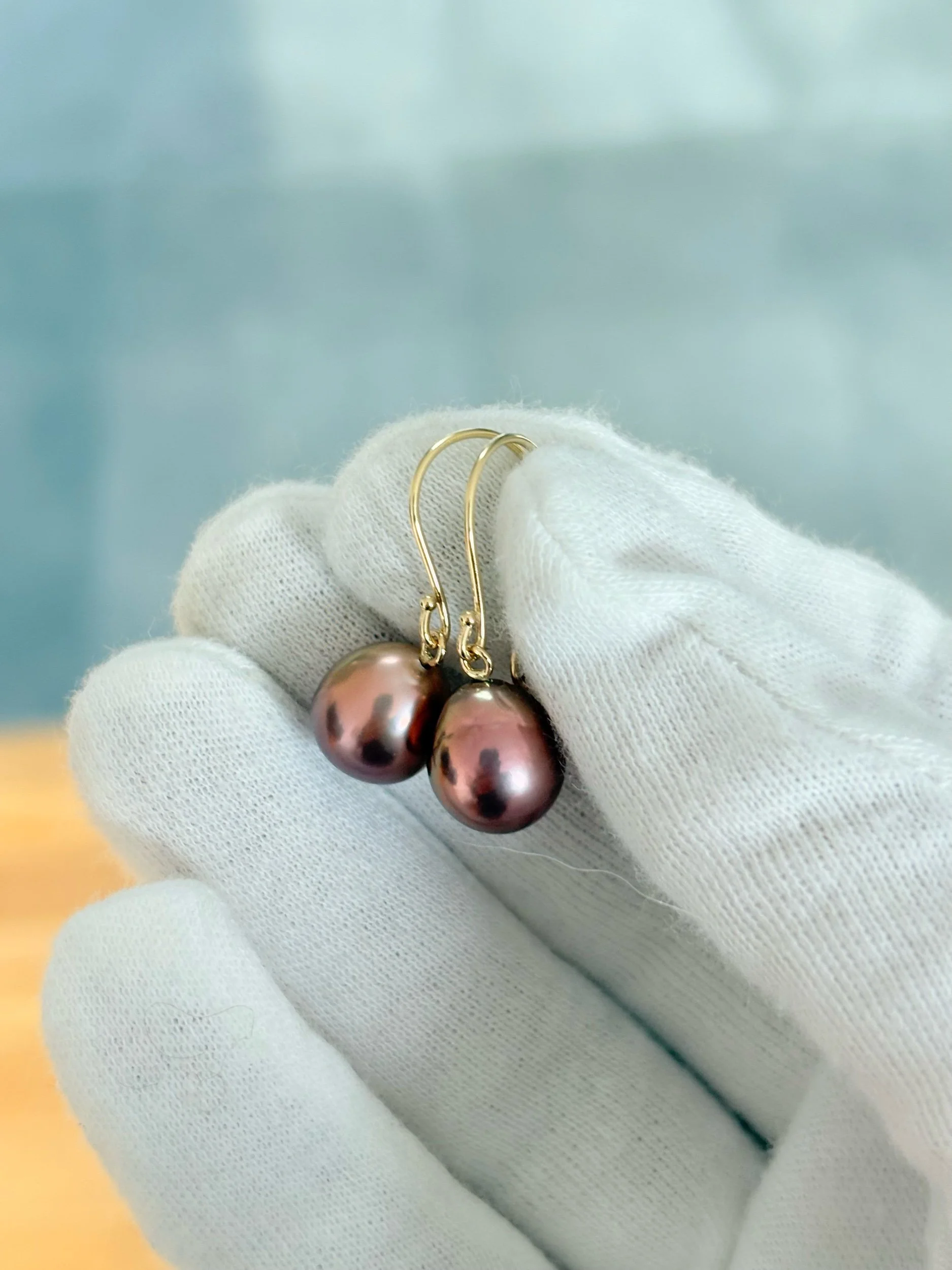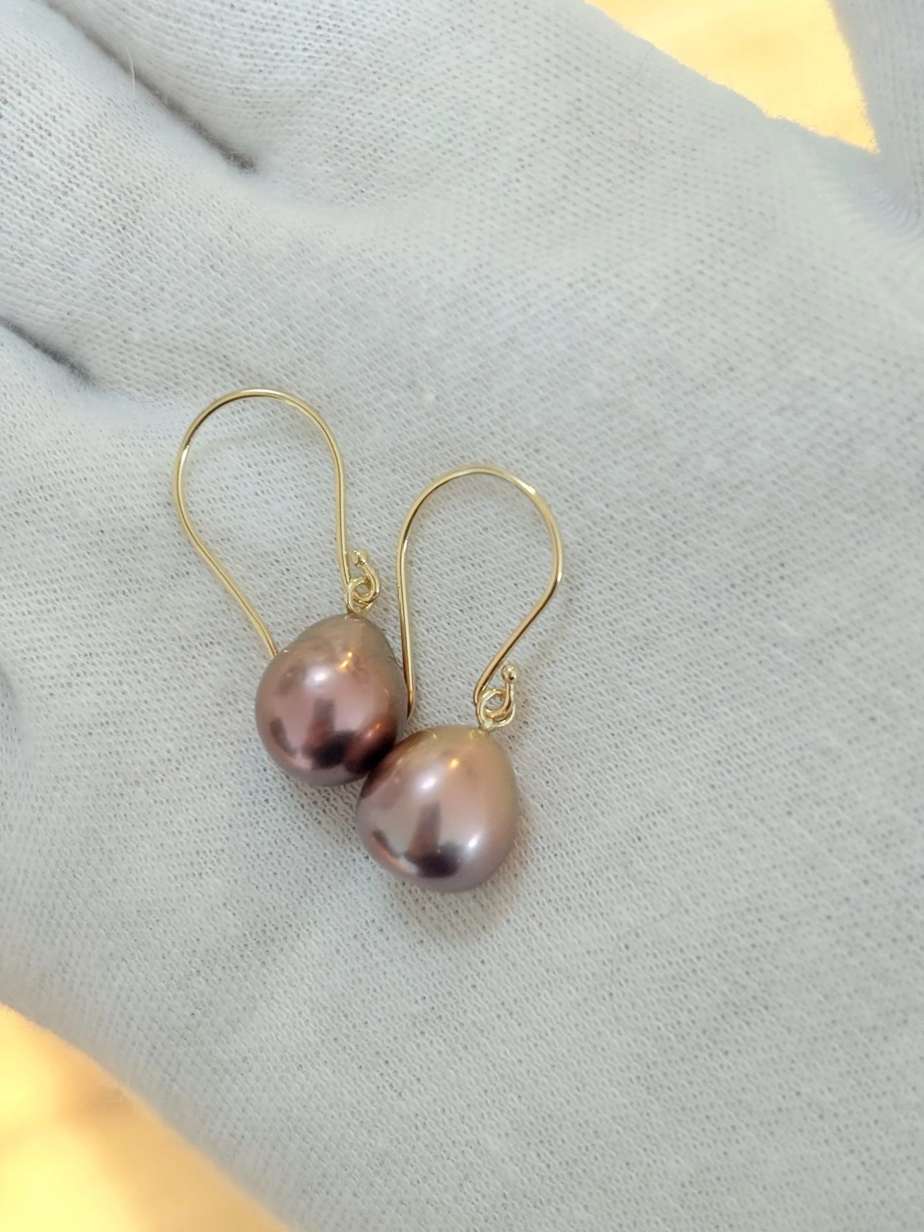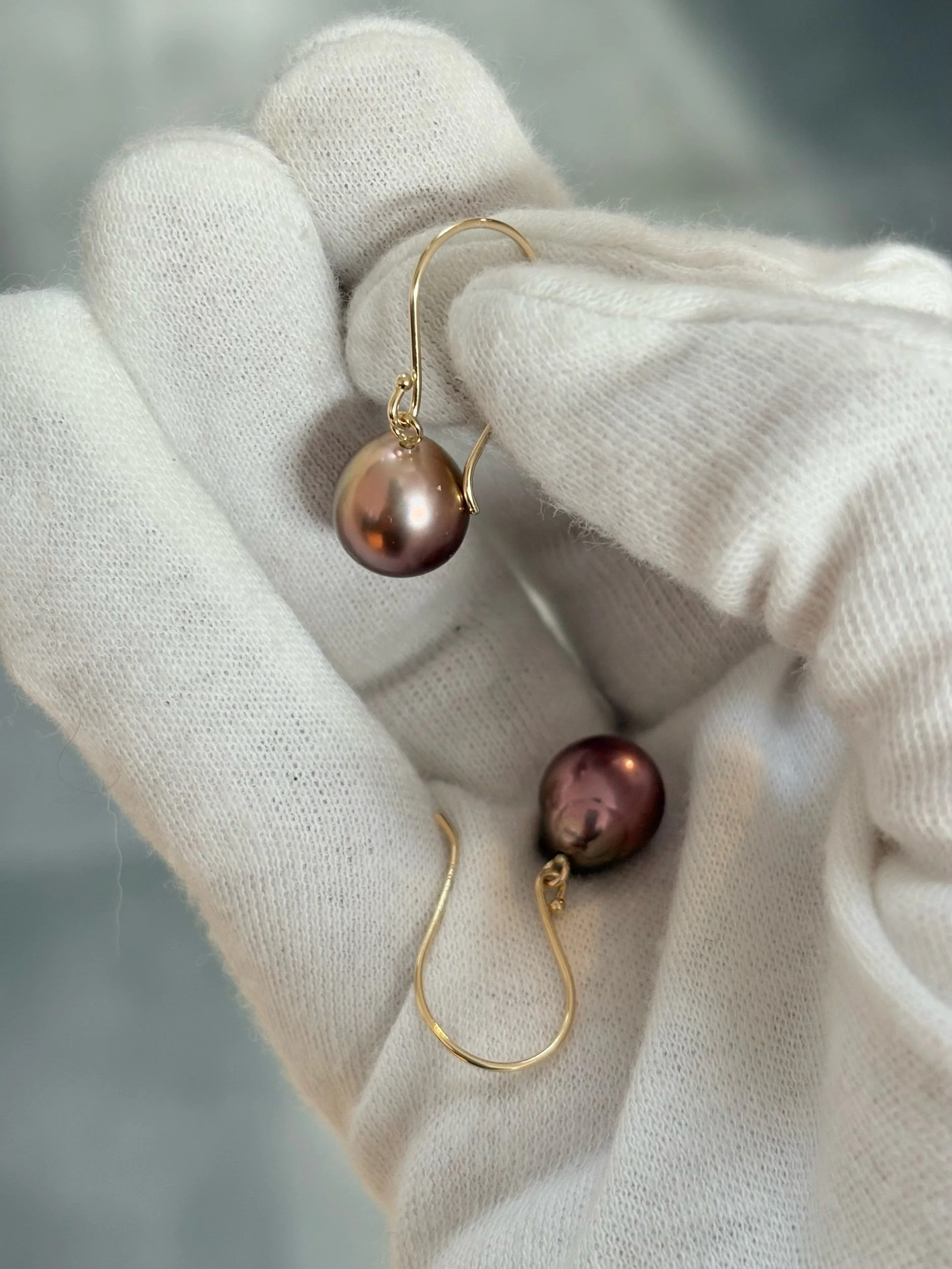 Natural Edison Pearl, 10-11mm, in metallic iridescent color with a beautiful luster, set in a 14K gold drop setting. The earrings measure 1 1/8 inches in length.