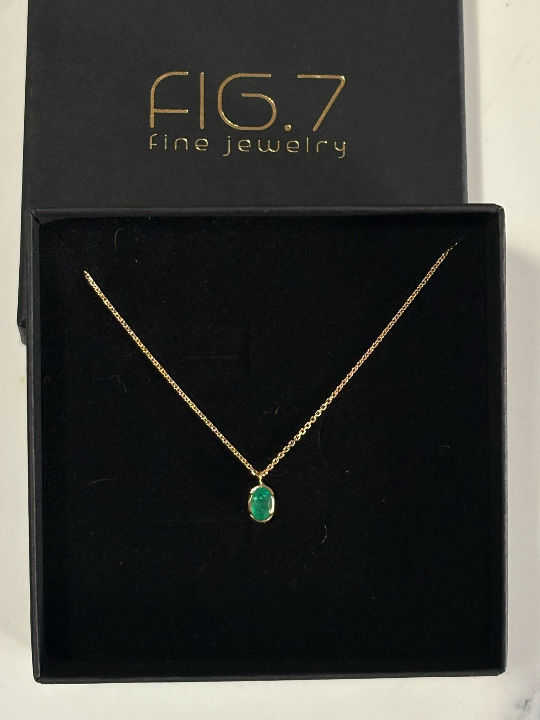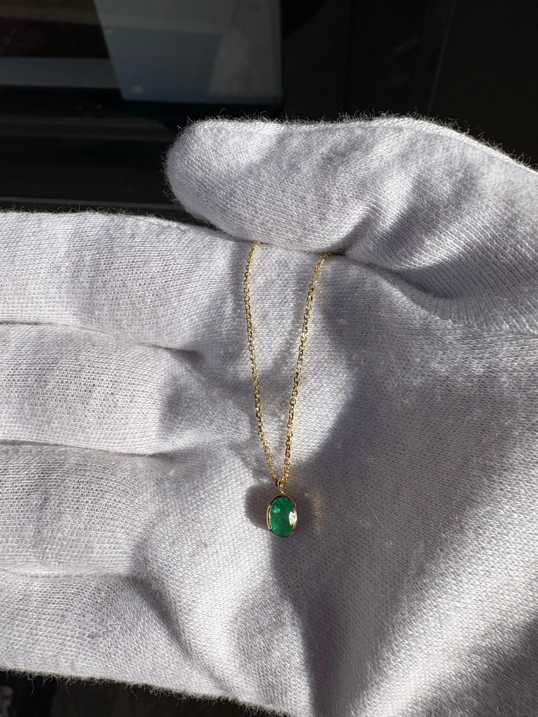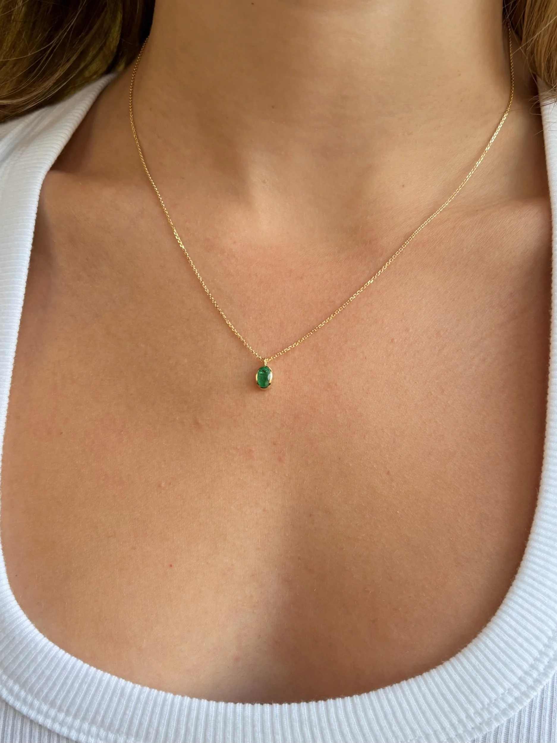 A vibrant green Brazilian emerald weighing 0.55 carats, sourced from the Carnaiba Mining District in Bahia. Handcrafted 18K gold bezel pendant, complemented by a delicate 14K gold diamond-cut chain imported from Italy. The open bezel showcases the emerald's 6x4 mm beauty. The necklace is 18” inches length. Fair trade Gemstone.