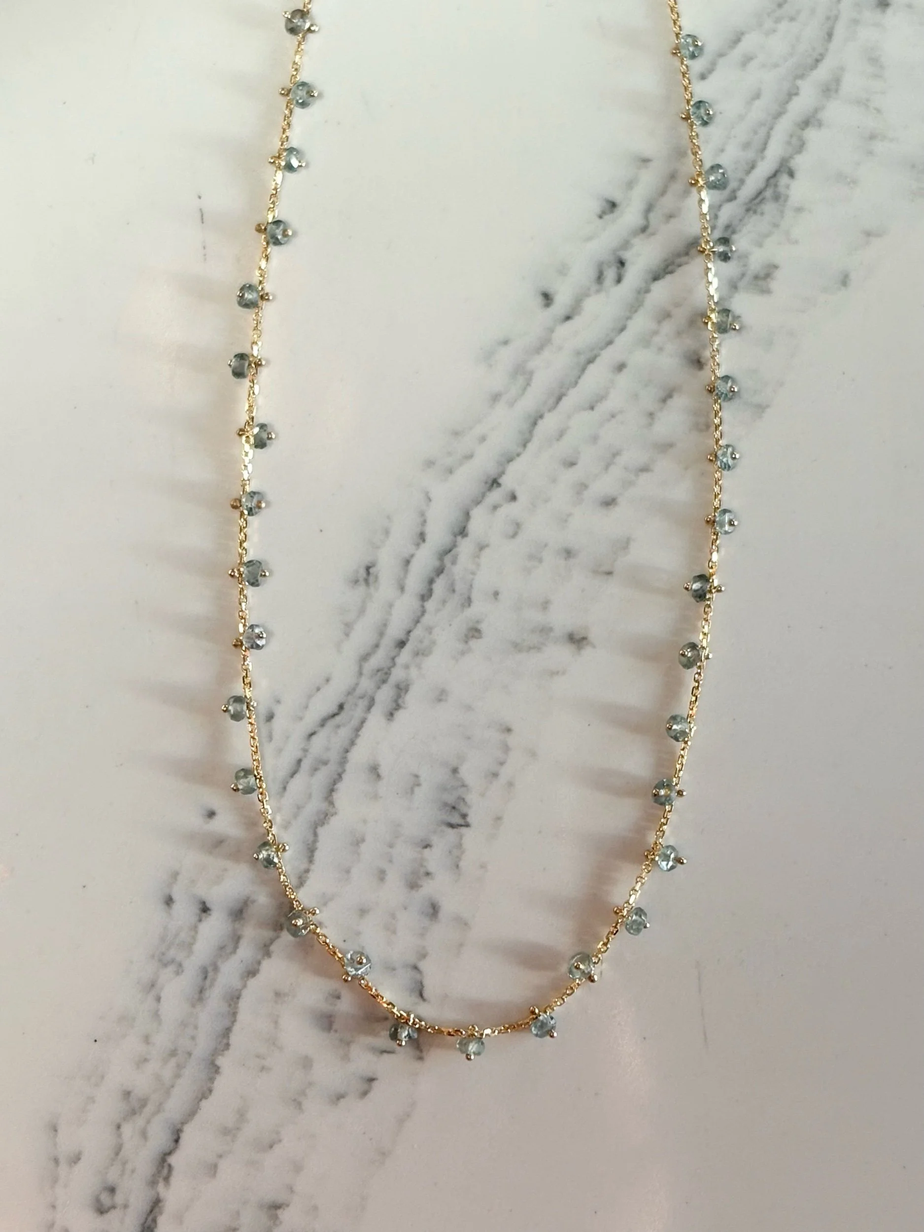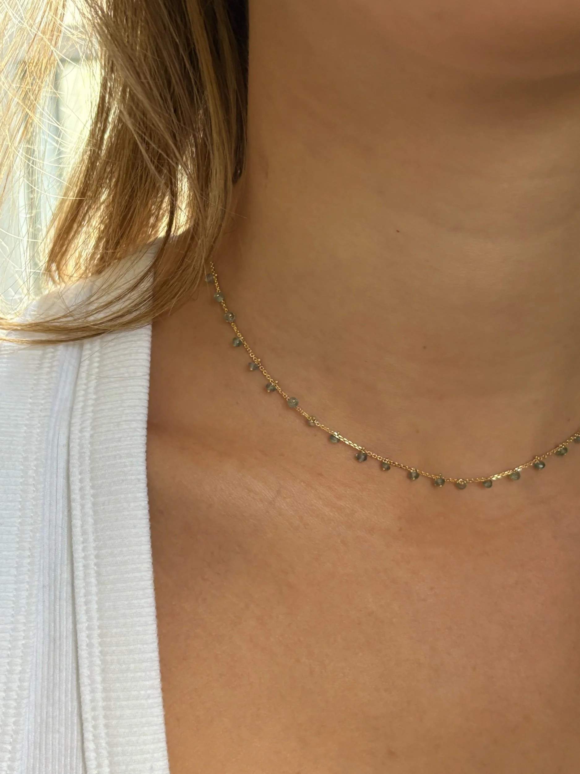 Natural Earth mined Green sapphire faceted beads from Songea Origin, are set on a 14K gold 16-inch diamond-cut chain imported from Italy. The sapphire have a sophisticated green color(under sunlight-fluorescent) and true gem clarity! They also display color change effect, with reddish brown displayed under night light(incandescent).