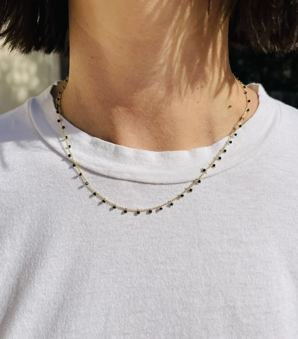 Shop › Tourmaline Necklace Image 1 of 2 Image 2 of 2 Tourmaline Necklace from $775.00 Black Tourmaline 2mm balls individuality set on a 14K gold diamond cut chain. Chain length: Select Chain length 16” 18” Quantity: Add To Cart Added! Black Tourmaline 2mm balls individuality set on a 14K gold diamond cut chain.