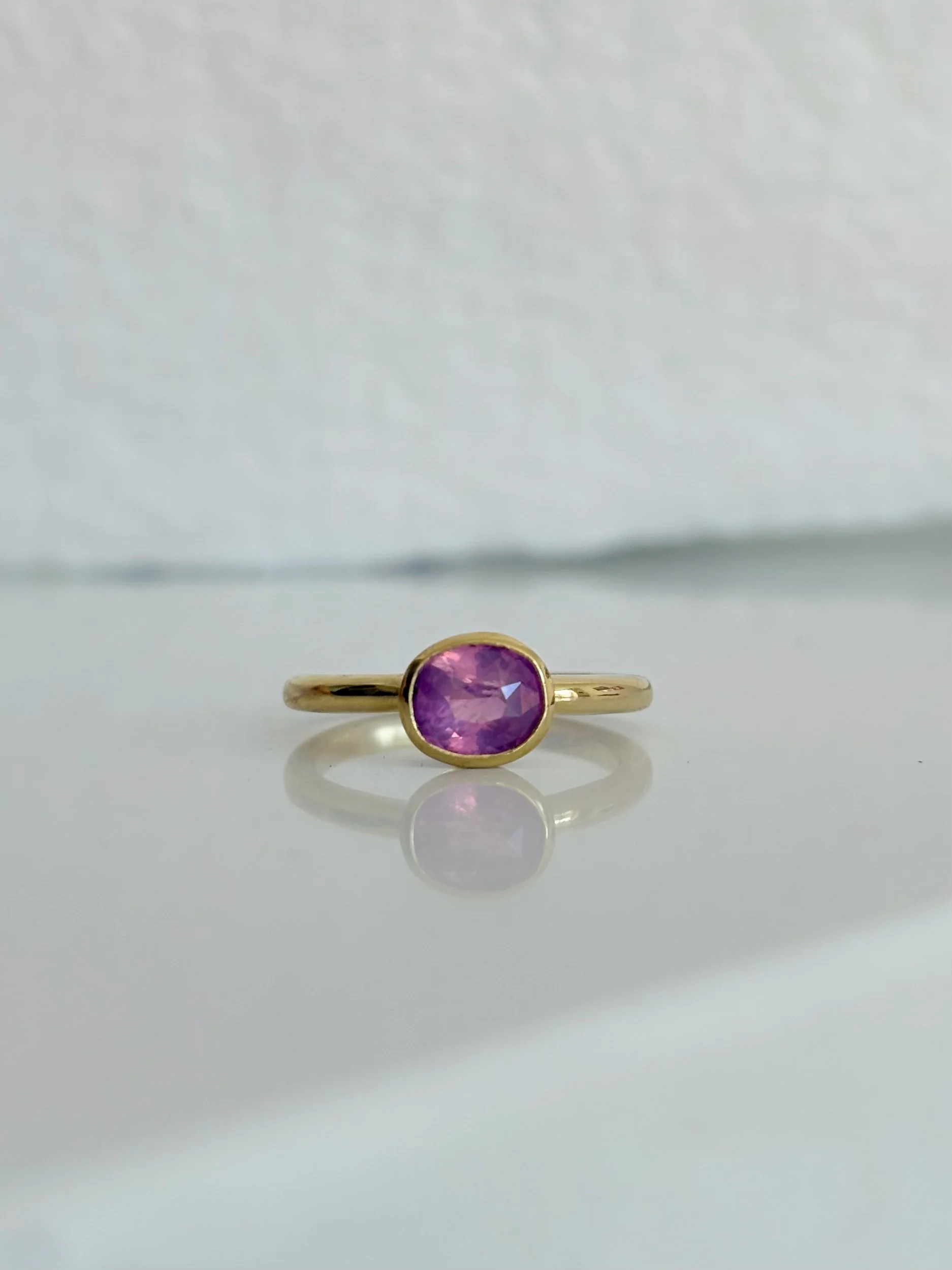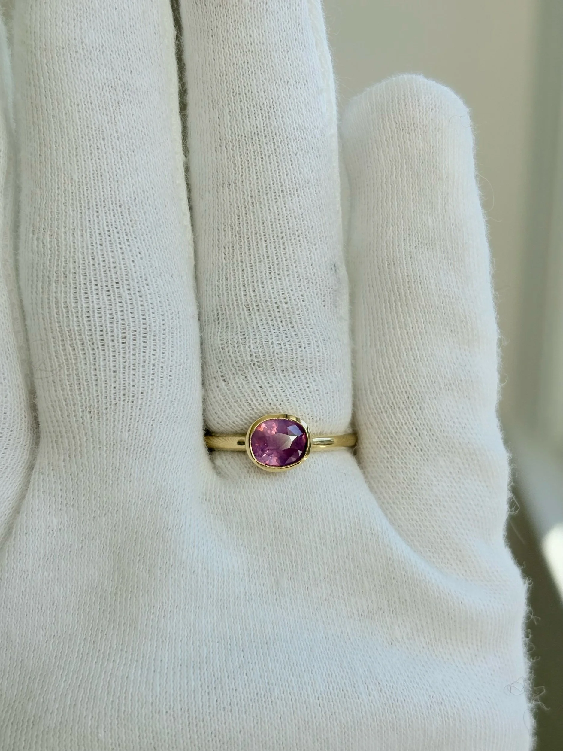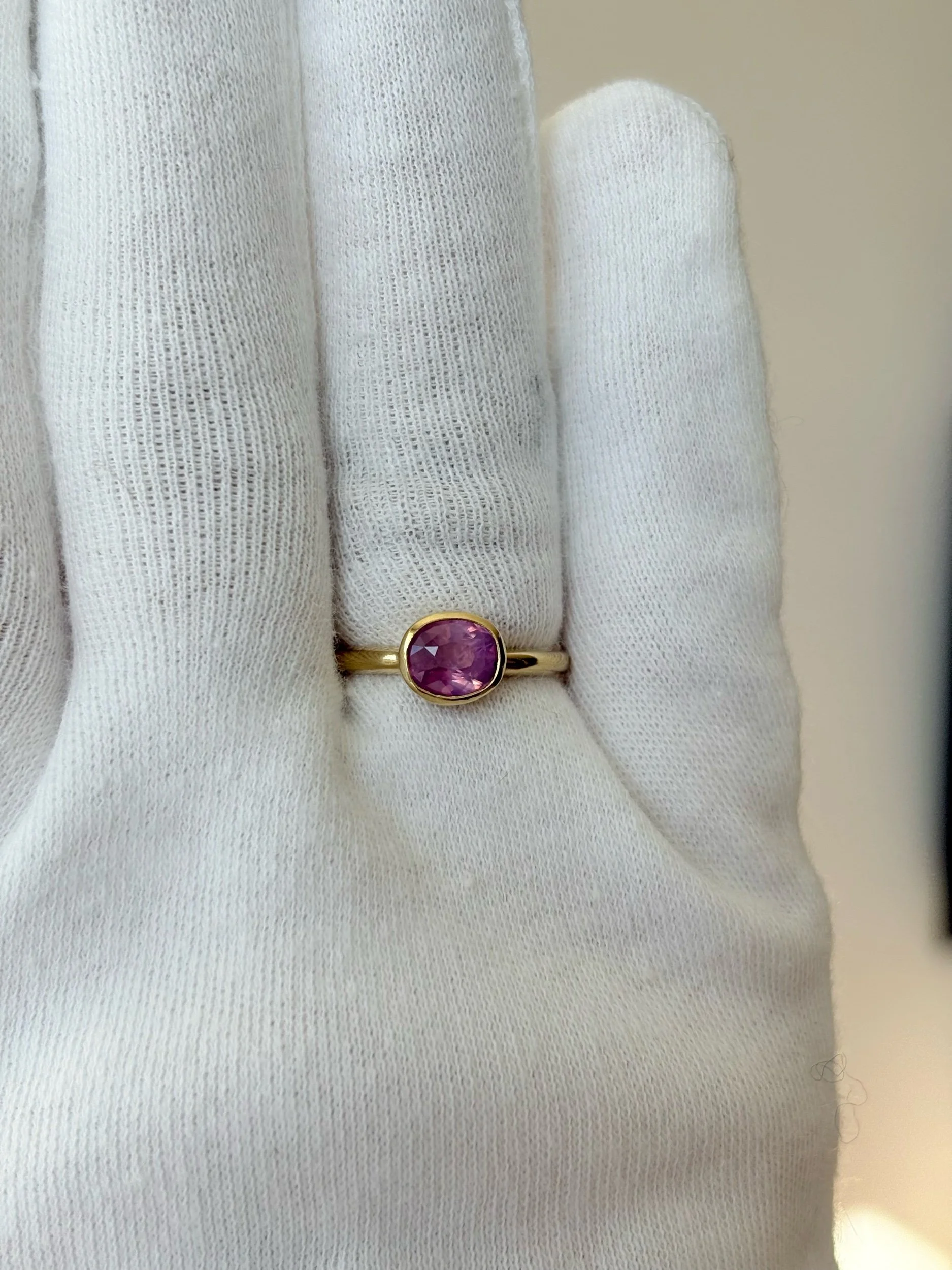 Handcrafted in 18K gold, this stunning Sri Lankan sapphire features a captivating blend of lavender and pink hues. It even catches a hint of orange when caught in the right lighting. Its beautiful color and silk inclusions give it an opalescent glow. Purple gemstones often exhibit a color shift, subtly changing in different lighting conditions, adding to their magical allure. This is a natural, untreated sapphire. The gemstone’s size is 1.52ct, 7.52x6.16x4.06mm. The ring band is 2.2mm in diameter.
